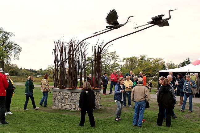 People are seen gathered around the Departure of the Great Blue Herons sculpture located in Alpena.