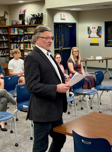 Robert H. Jackson Elementary School Music Teacher, and Music Club Adviser Drew Minton recently speaks to the Frewsburg Central School District Board of Education.