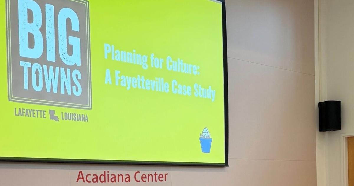 Joanna Sheehan Bell of the city of Fayetteville, Ark., left, and Jill Stilwell of Stilwell Cultural Consulting with Sam Oliver, executive director of the Acadiana Center for the Arts, discuss planning for culture during the Big Towns conference Wednesday, April 22, 2026, in Lafayette, La.