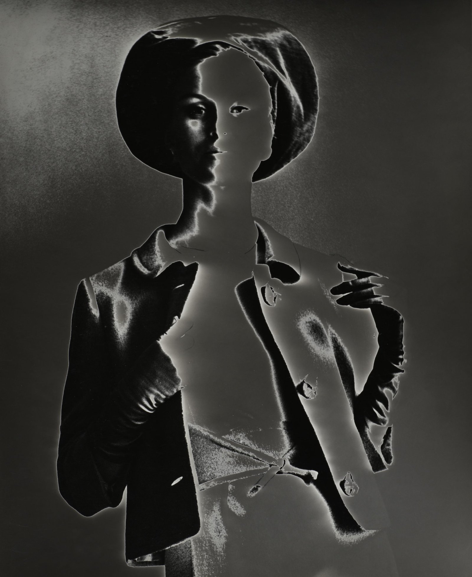 Bassman’s photographs, in fact, looked more like illustrations. She achieved this effect through darkroom experimentation and manipulation: donning a cardboard mask with a pinhole aperture, she selectively exposed portions of the paper to light, tracing the contours of the garments until they seemed to dissolve into atmosphere.