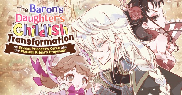 Manga UP! describes The Baron’s Daughter’s Childish Transformation: An Envious Princess’s Curse and the Platinum Knight’s Proposal?!: