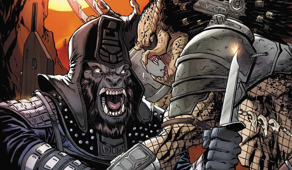 The official synopsis states, “Worlds collide when a deadly Yautja crash-lands on the legendary Planet of the Apes! After a rescue mission gone wrong, astronaut Arch finds herself embedded in a hostile ape society where humans are subservient. But the hunters soon became the hunted when the apes find themselves being stalked by Predators! A three-way war is about to erupt between humans, apes and Yautja – who will reign supreme?!”