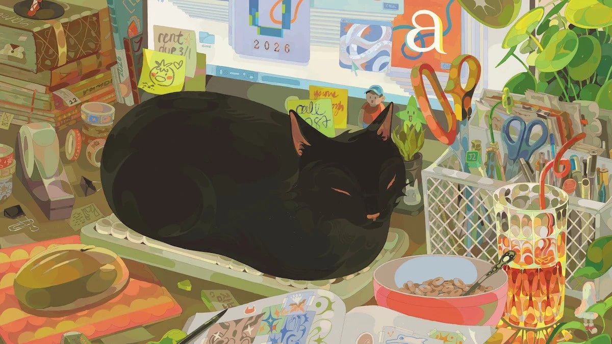 This year’s illustration belongs to Deb JJ Lee, and it shows a black cat loafed up on a keyboard that rests on a desk that clearly belongs to a comic book creator. Scissors, rulers, sketchbooks, and all manner of pens populate the desk. It speaks to the small universes creative people build for themselves to produce work. It set the tone for the festival.