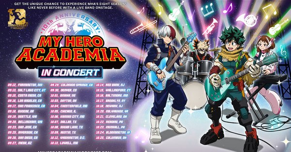 TOHO, GEA Live, and RoadCo Entertainment announced on Tuesday the U.S. tour dates for the “My Hero Academia in Concert” world tour, featuring composer Yūki Hayashi and scenes from the anime. The U.S. leg of the tour begins on September 12 and ends on October 25.
