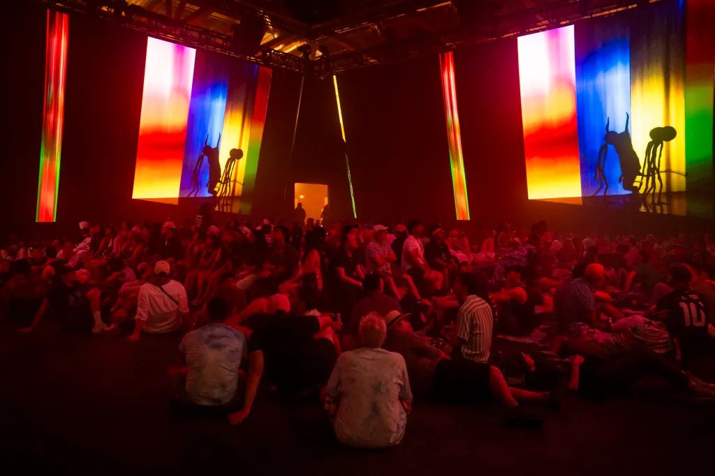 Visitors sit and lie on the floor during a screening of “Radiohead Motion Picture House: Kid A Mnesia” inside the Bunker during Weekend One of the Coachella Valley Music and Arts Festival in Indio on Saturday, April 11, 2026. (Photo by Watchara Phomicinda, Contributing Photographer)