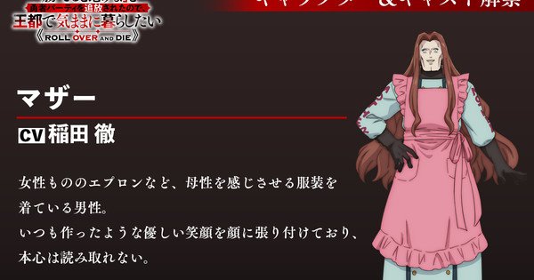 The staff of the television anime based on writer kiki and illustrator Kinta’s ROLL OVER AND DIE: I Will Fight for an Ordinary Life with My Love and Cursed Sword! (“Omae Gotoki ga Maō ni Kateru to Omou na” to Yūsha Party o Tsuihō Sareta node, Ōto de Kimama ni Kurashitai) light novel series announced on Tuesday that Tetsu Inada will voice the character Mother, who will appear in the anime’s 12th episode on Thursday. Mother is a man who wears an apron and evokes a sense of motherhood. He always wears a forced, gentle smile, making it hard to read his true emotions.