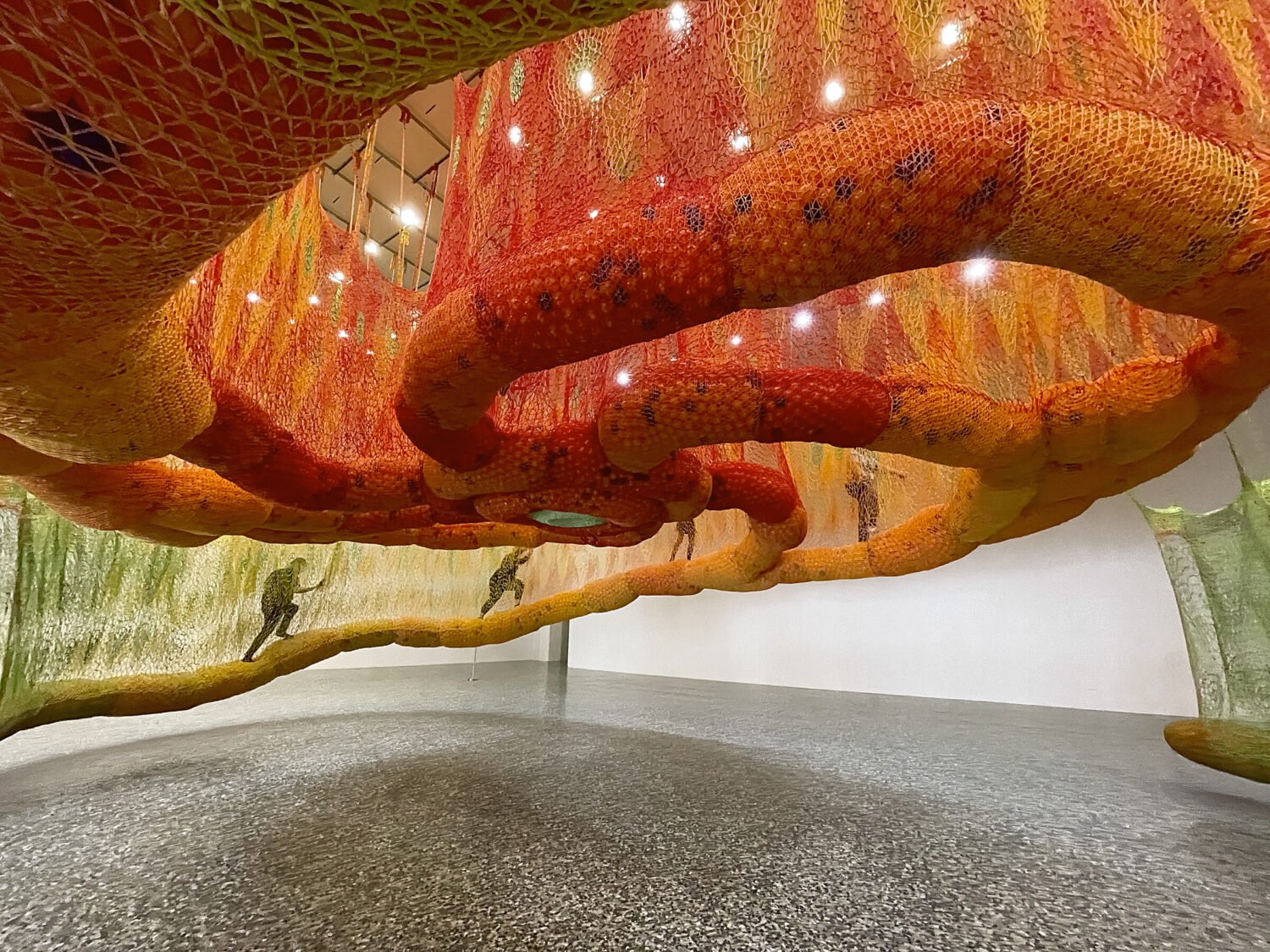 The 35-foot structure is made out of vibrant orange, yellow and green paracord that was hand-woven by Brazilian artist Ernesto Neto. It features walkable pathways filled with hollow plastic balls like you would find in a children’s ball pit. The whole thing is suspended from the ceiling and weighs 6,000 pounds.